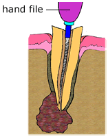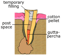 The canals are refilled with a root canal filling and the opening is sealed with a sterile cotton pellet and a temporary filling.